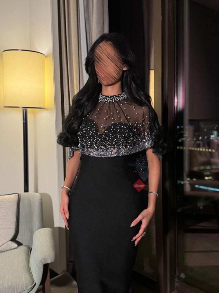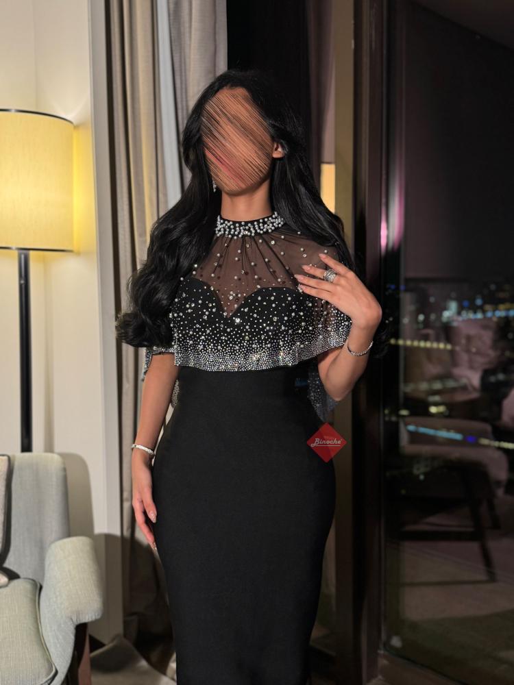 - تفاصيل اكثر عن الفستان : فستان كريب سادة مع وشاح مزين باللؤلؤ الفاخر