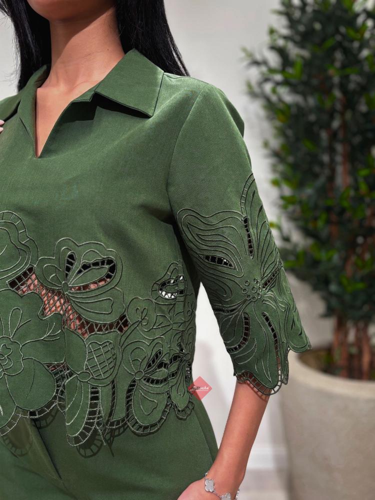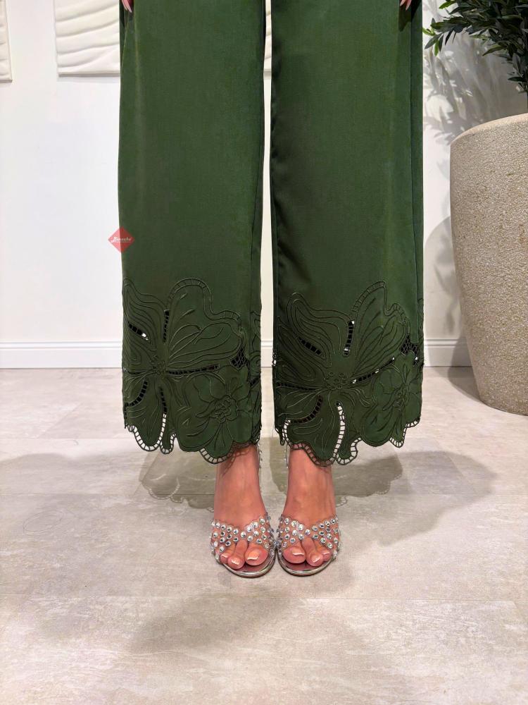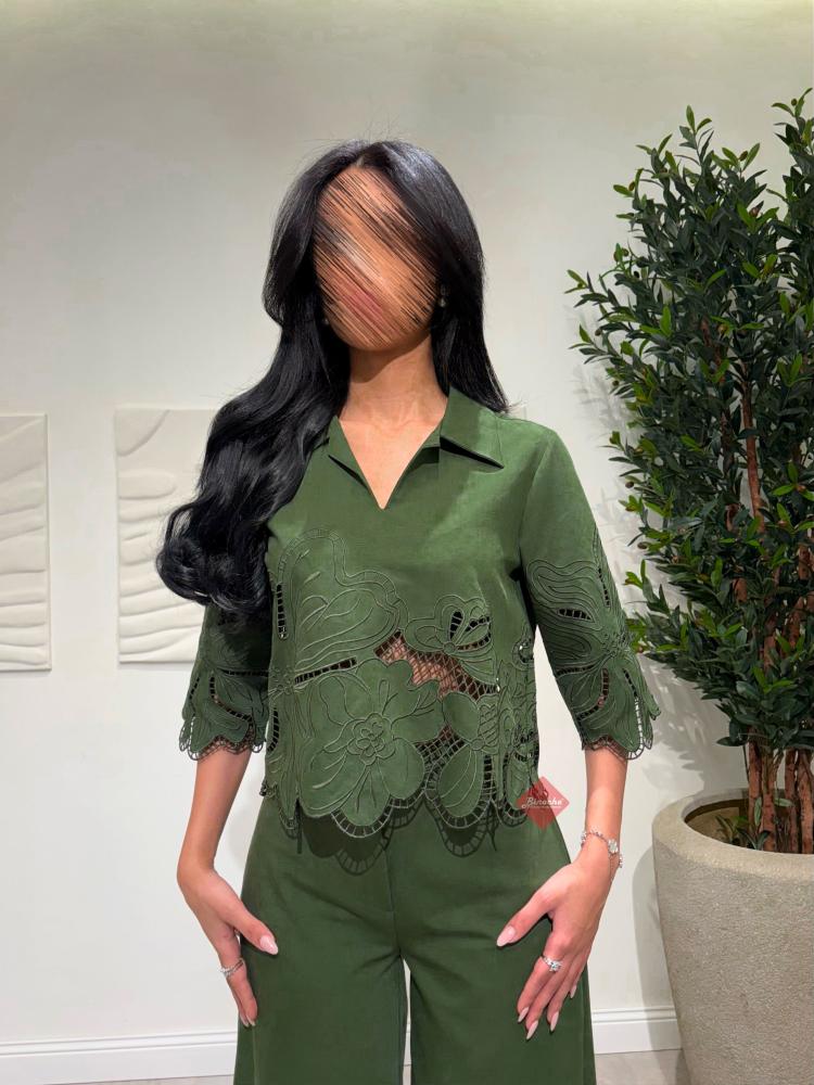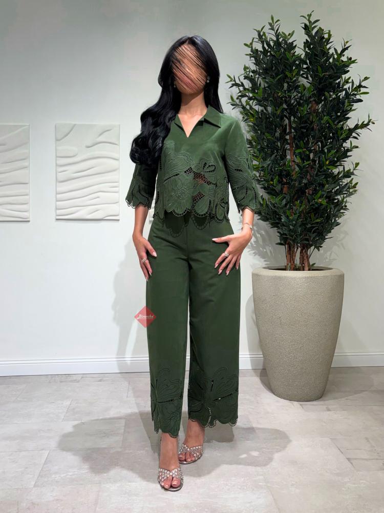 تفاصيل الطقم : تألقي بإطلالة عصرية وفريدة مع طقم كريستال المكون من قطعتين، والذي يجمع بين الراحة والأناقة المتناهية. يتميز هذا الطقم بتصميمه المبتكر الذي يعتمد على التطريز المفرغ (Cut-out) بنقشات الزهور على أطراف القميص والبنطال، مما يمنحه لمسة فنية جذابة.