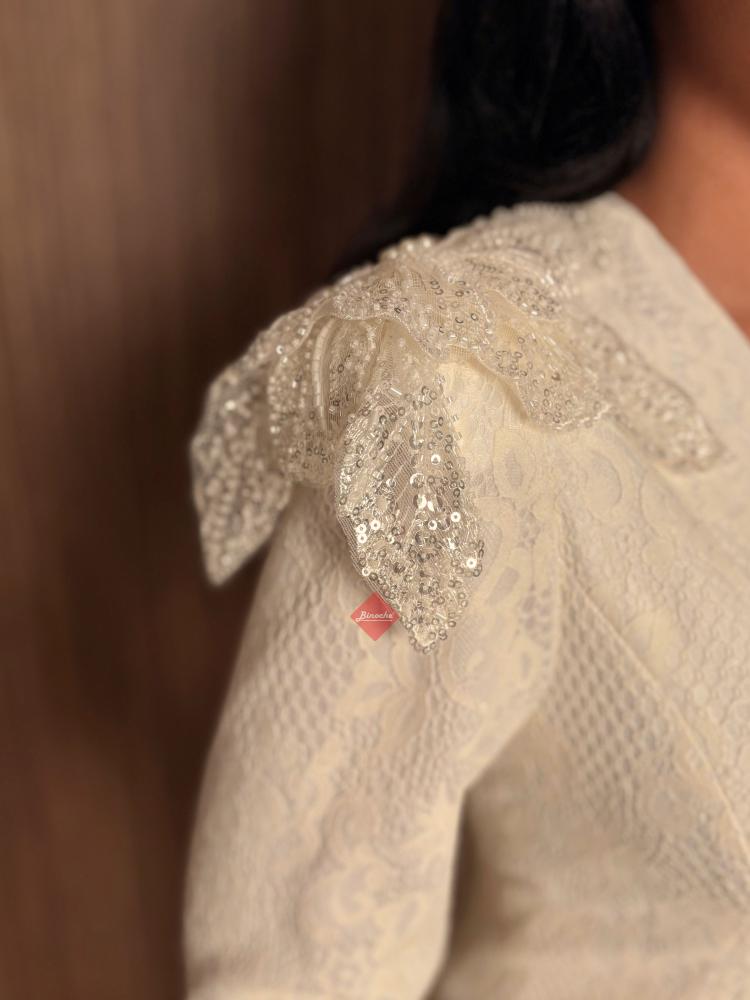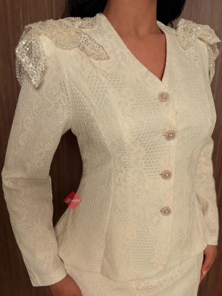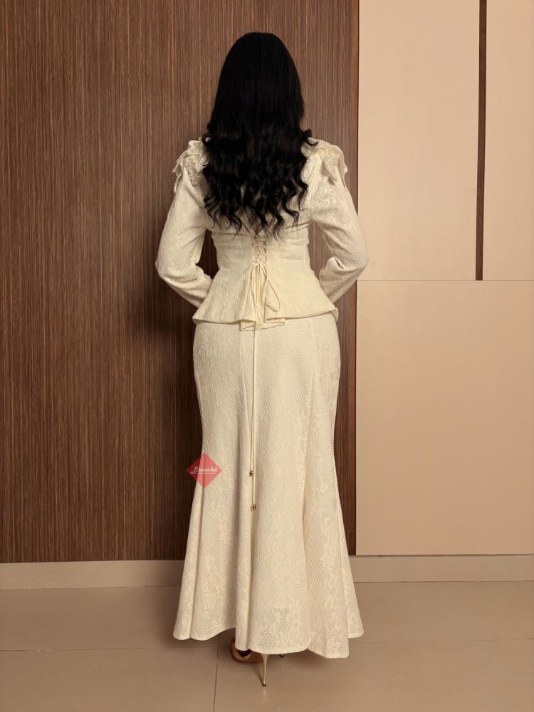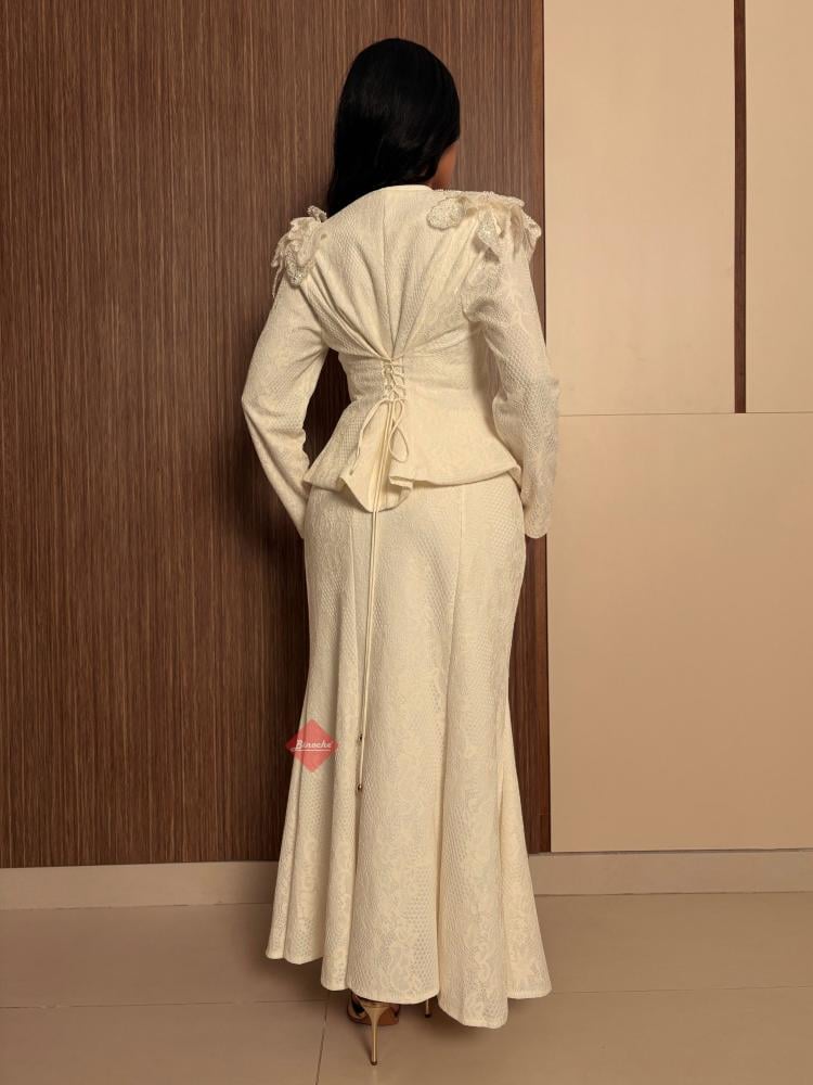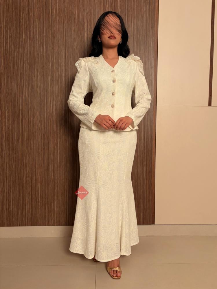 تفاصيل اكثر عن الطقم: يعد هذا الطقم الأبيض (قطعتين) قطعة استثنائية من كولكشن العيد والمناسبات، حيث يبرز فيه التناغم بين الجاكيت المنحوت والتنورة الانسيابية. صُمم الجاكيت من الدانتيل الفرنسي المشغول بدقة مع ياقة رسمية مرتفعة تضفي هيبة وأناقة ملكية. أما التنورة، فتأتي بتصميم دانتيل الذي يمنحكِ حركة درامية خفيفة تليق بمناسباتكِ السعيدة.