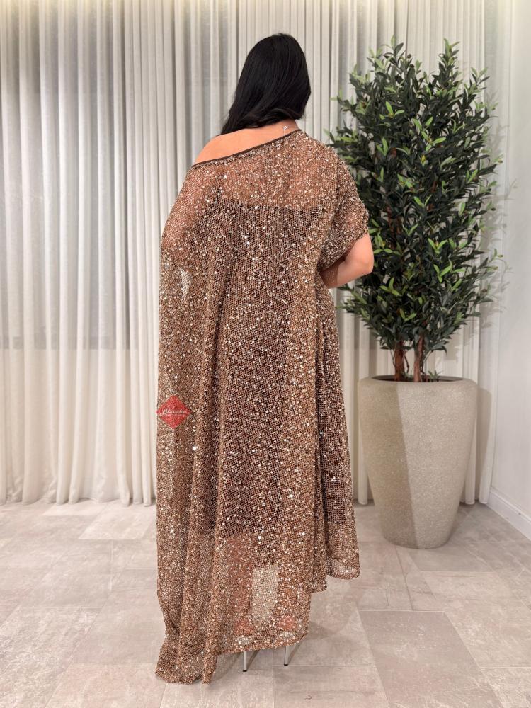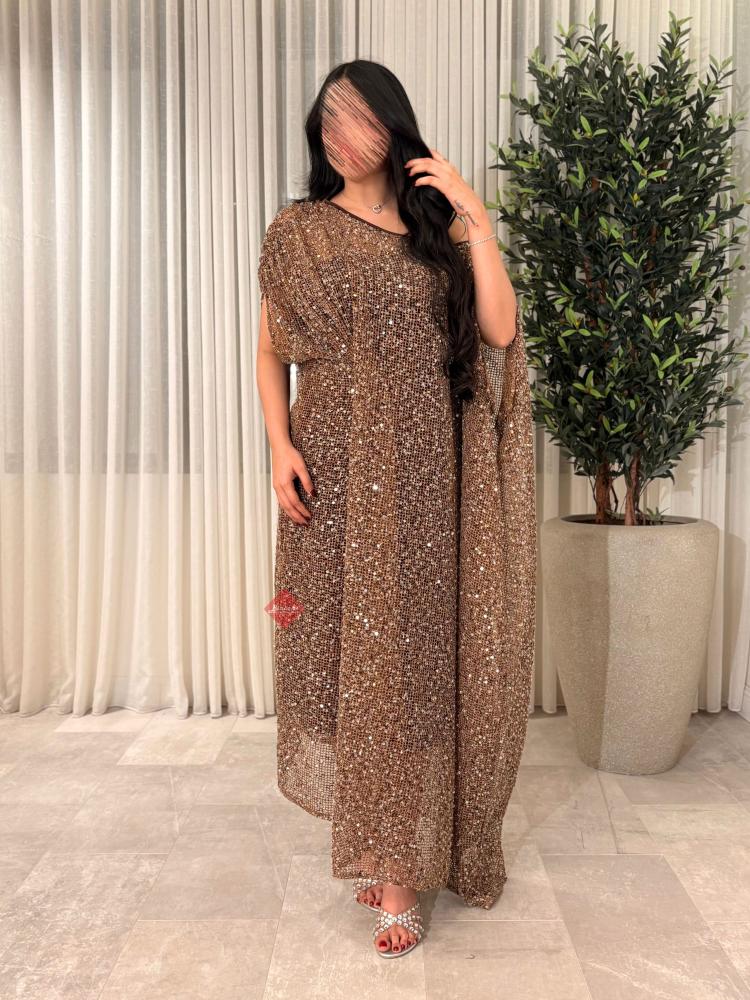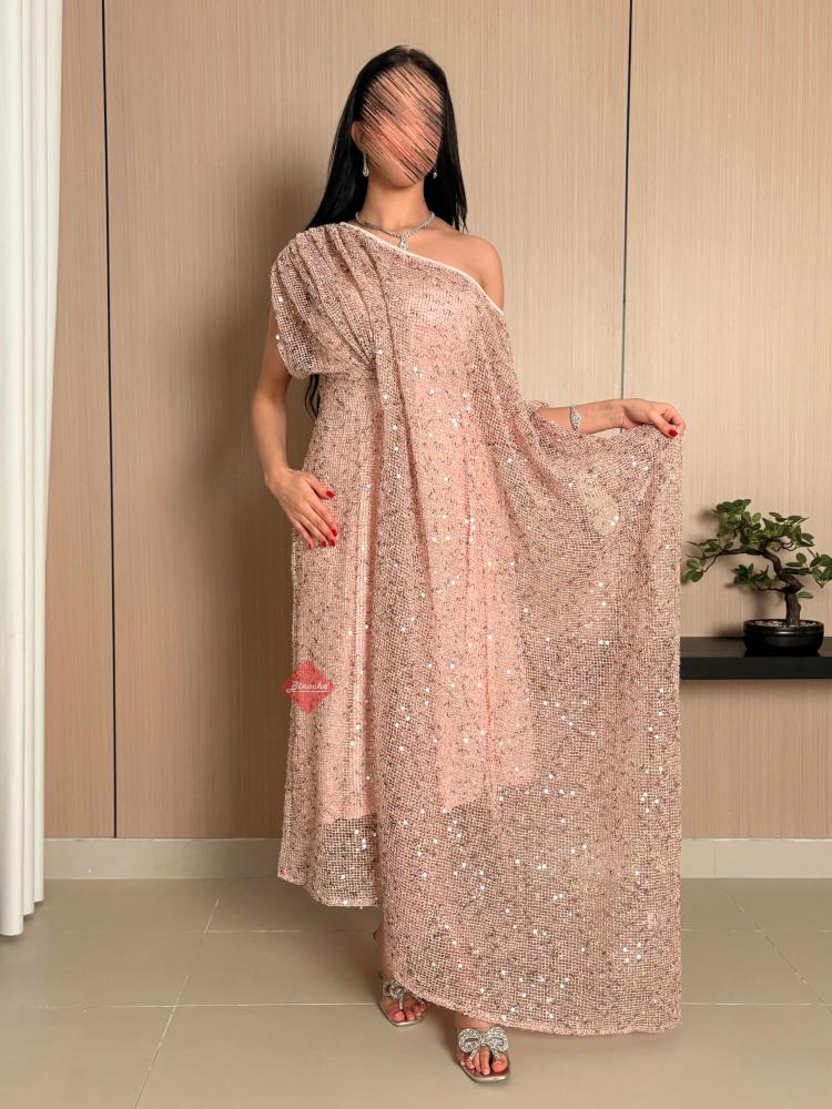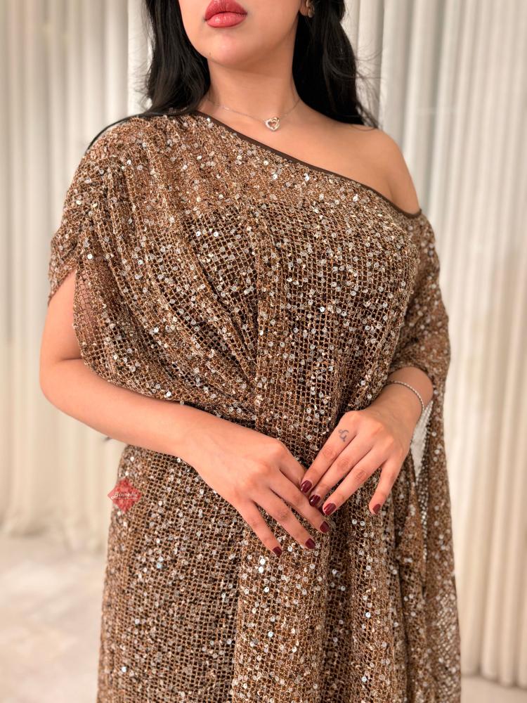 تفاصيل اكثر عن الفستان: يتميز هذا الفستان بخامته الفريدة المصممة على هيئة "شباك" (Net) متداخلة بدقة، ومرصعة بالكامل بحبيبات الترتر (Sequins) التي تعكس الضوء مع كل حركة، مما يمنحكِ حضوراً مشرقاً في أرقى السهرات.