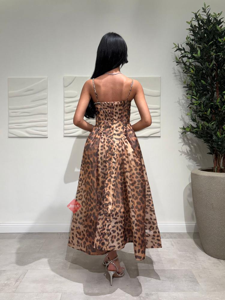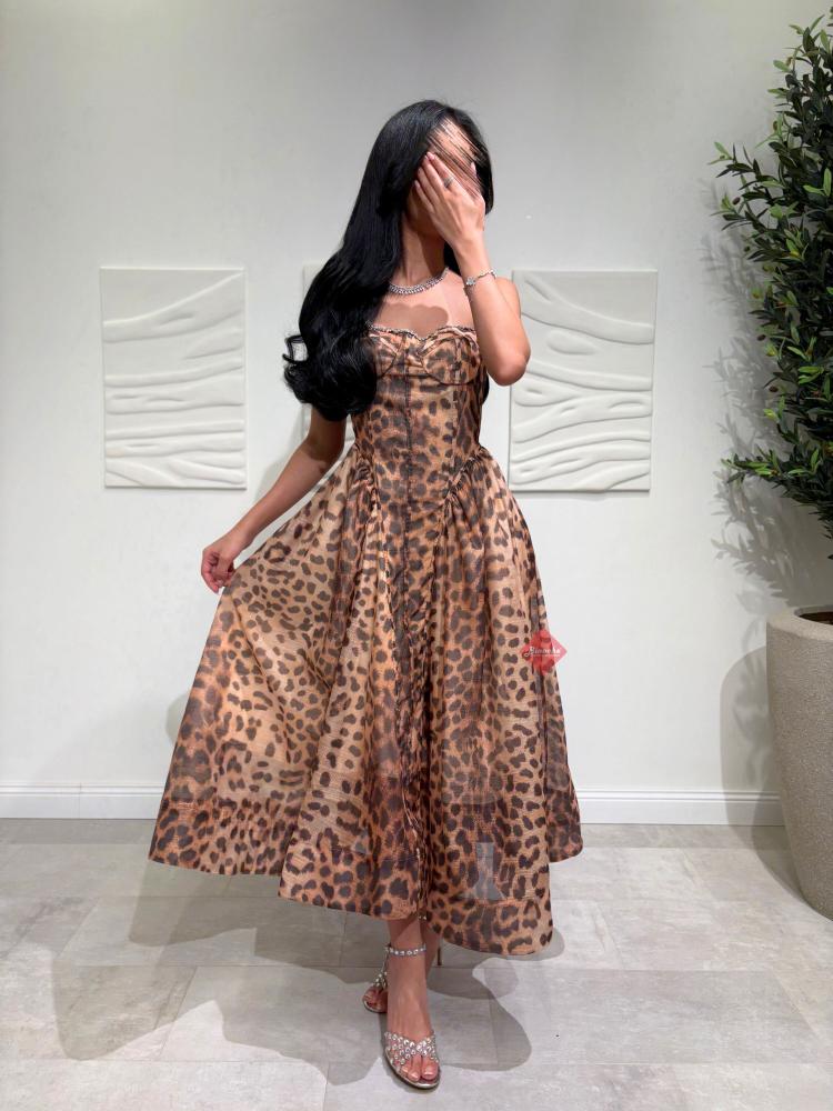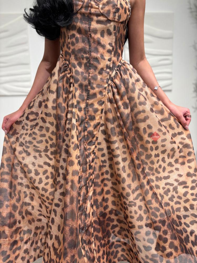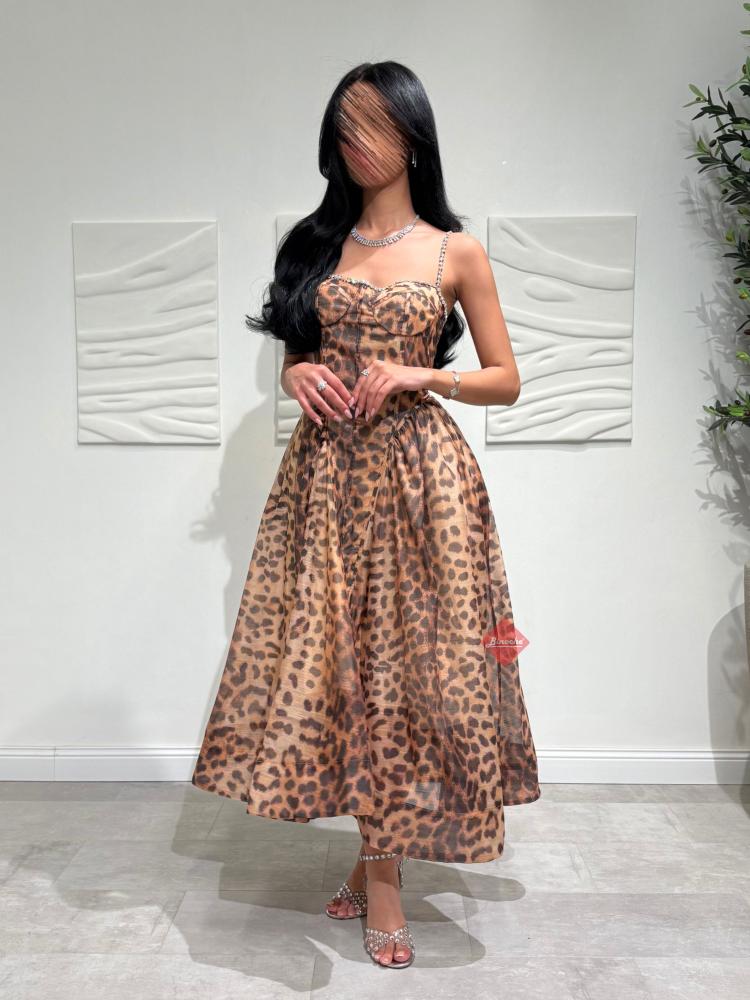 . يجمع هذا الفستان بين كلاسيكية نقشة الفهد (التايجر) والتصميم العصري الذي يبرز جمال القوام بفضل قصة