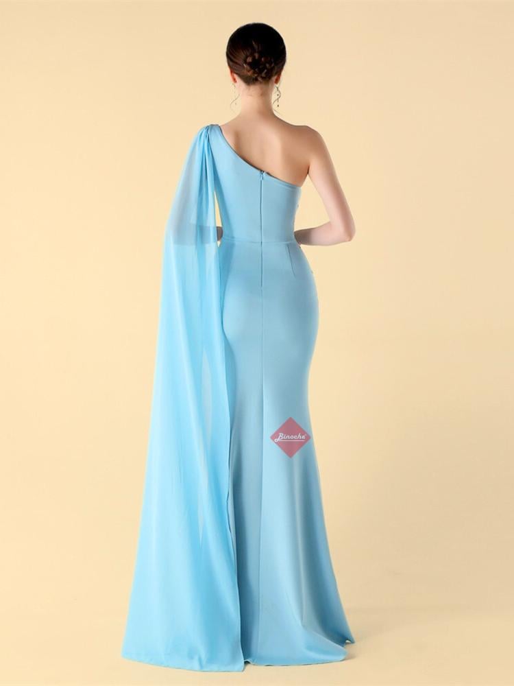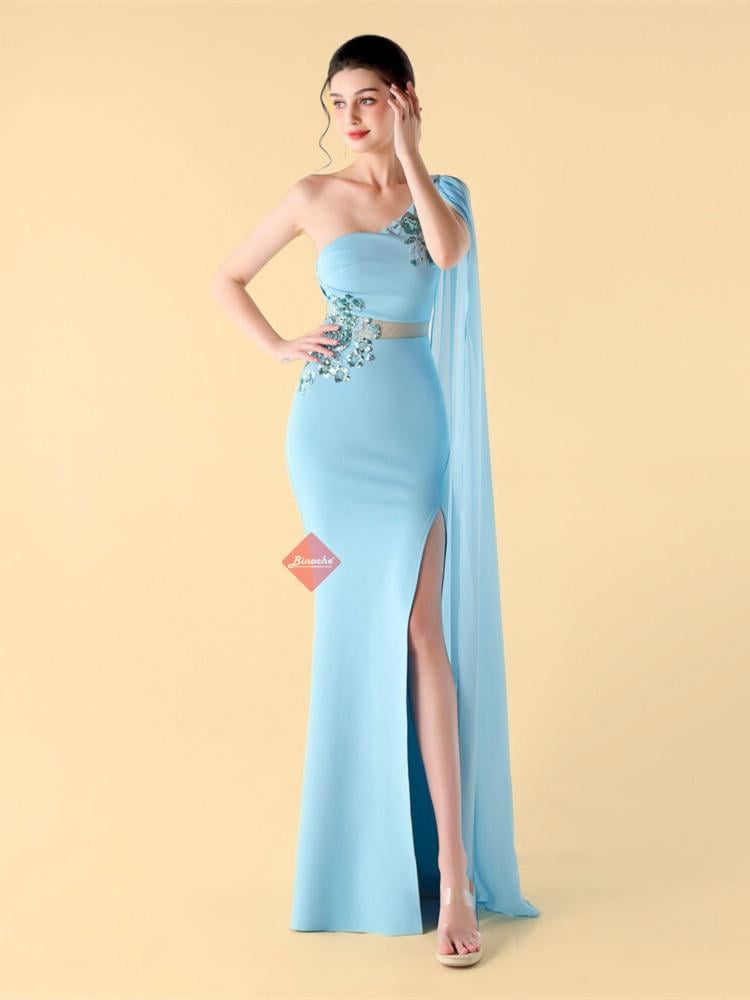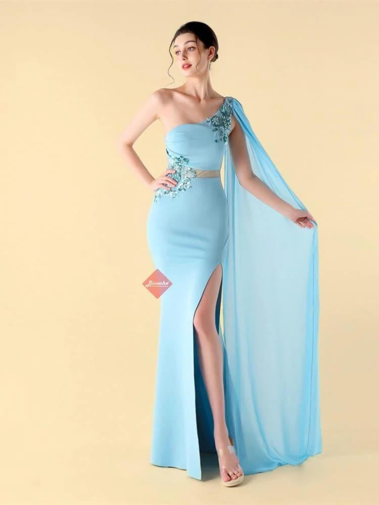 - تفاصيل اكثر عن الفستان: فستان سهرة سواريه طويل بقصة ضيقة، مصنوع من الكريب الناعم والمريح و اكمام شيفون.