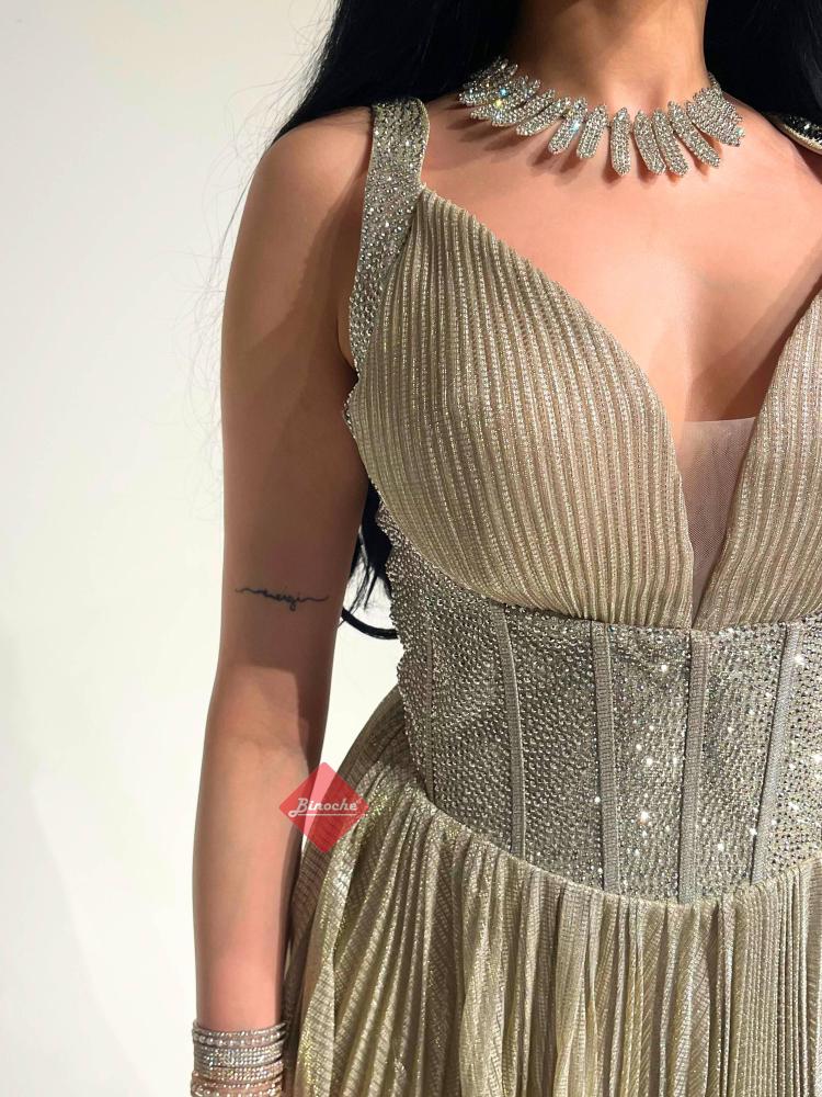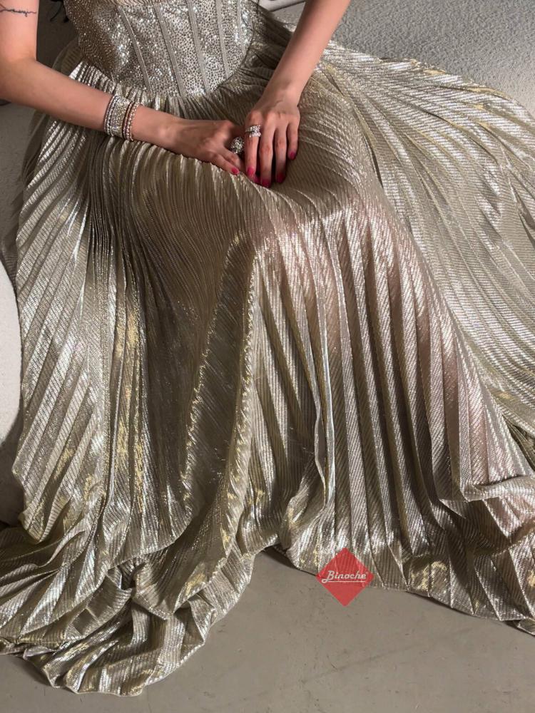 يتميّز الفستان بقصة جذابة على شكل كورسيه مزيّن بالكريستالات اللامعة من منطقة الخصر، مما يمنح الجسم تحديدًا أنثويًا وأناقة ملكية. أما القماش فهو بليسيه لامع بطيات انسيابية، تعكس الضوء بطريقة ساحرة مع كل حركة.