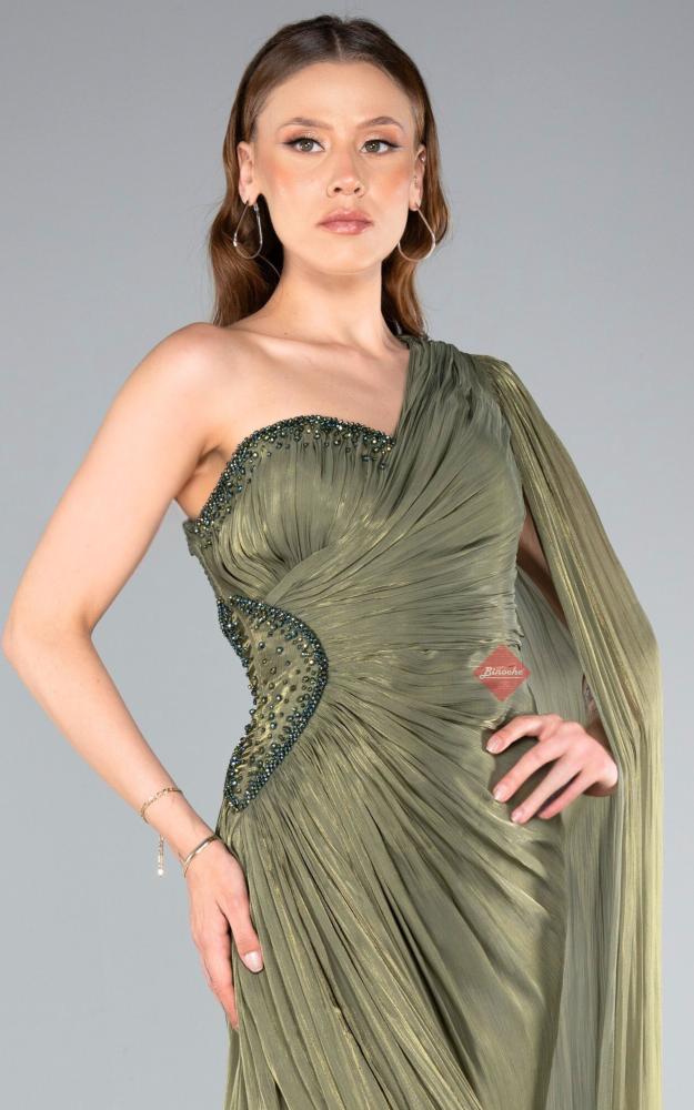 تفاصيل اكثر عن الفستان: فستان سهرة أنيق بتصميم عصري، يتميز بقصة كتف واحد (ون شولدر) ساحرة تبرز أنوثتك. يضفي القماش الناعم من فتافيت السكر لمسة من الرقي والأناقة على إطلالتك، بينما تمنحك قصة البليسيه المتدفقة حركة وحيوية. يأتي الفستان بلون بترولي بتدرجات جذابة، مع وشاح أنيق يضفي لمسة من الفخامة..