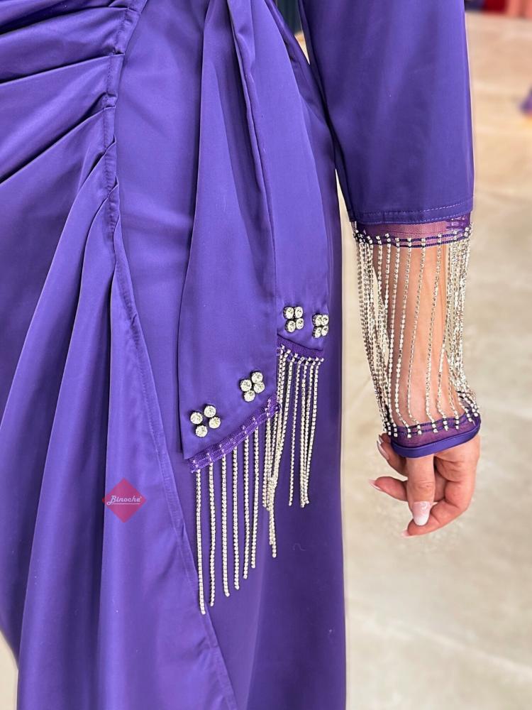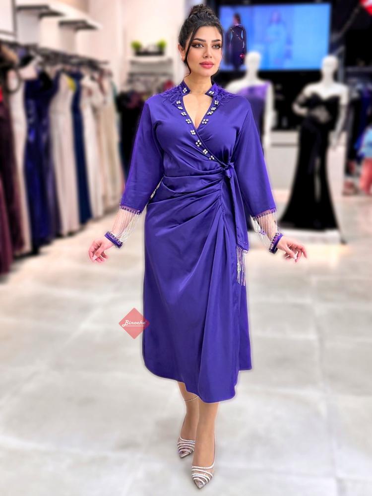 فستان ناعم ميدي باكمام مزينة بالكريستال