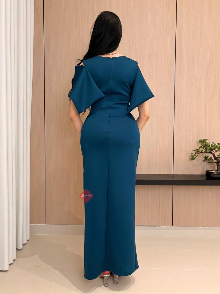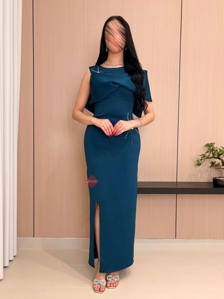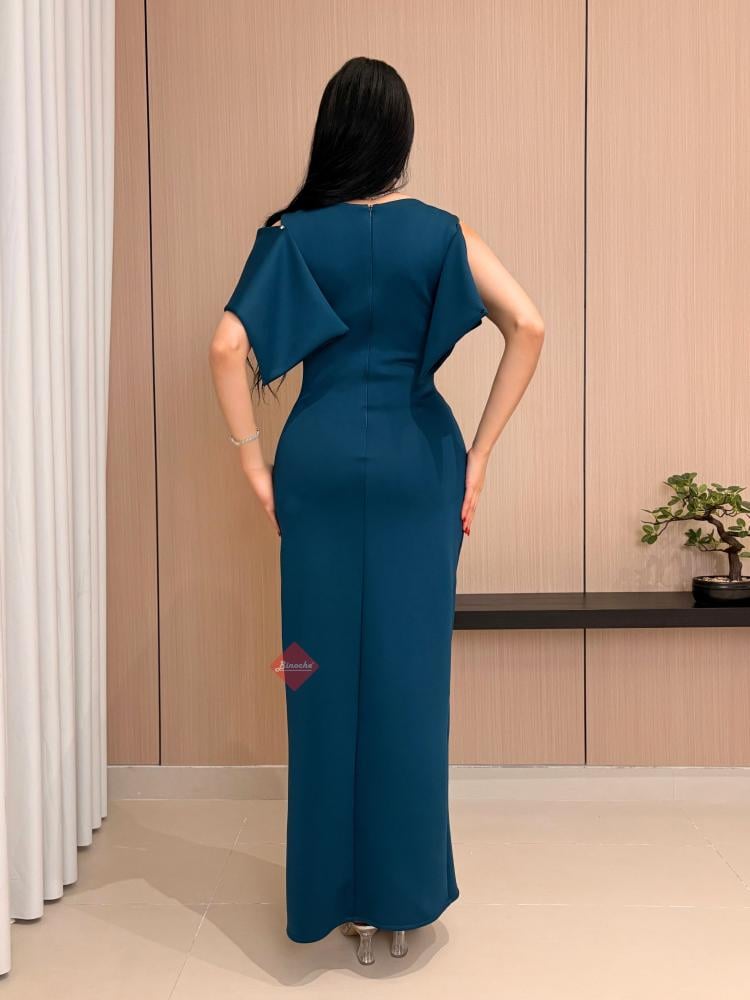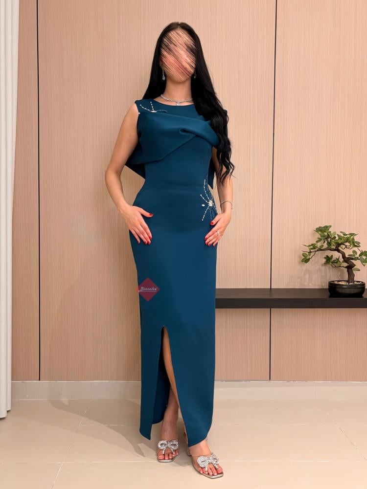 تألقي بجاذبية اللون البترولي مع هذا الفستان المصمم ليمنحكِ إطلالة أنثوية تجمع بين البساطة والفخامة. يعد هذا الفستان الخيار الأمثل للمناسبات الرسمية والسهرات الراقية، حيث يتميز بقصة انسيابية تعانق القوام بنعومة وتبرز جماله بأسلوب راقٍ. صُممت منطقة الصدر بنمط "الدرابيه" (Draped) المتقاطع الذي يضفي لمسة من العصرية، بينما يزين التطريز الكريستالي اللامع منطقة الخصر والكتف ليمنحكِ بريقاً استثنائياً تحت الأضواء.