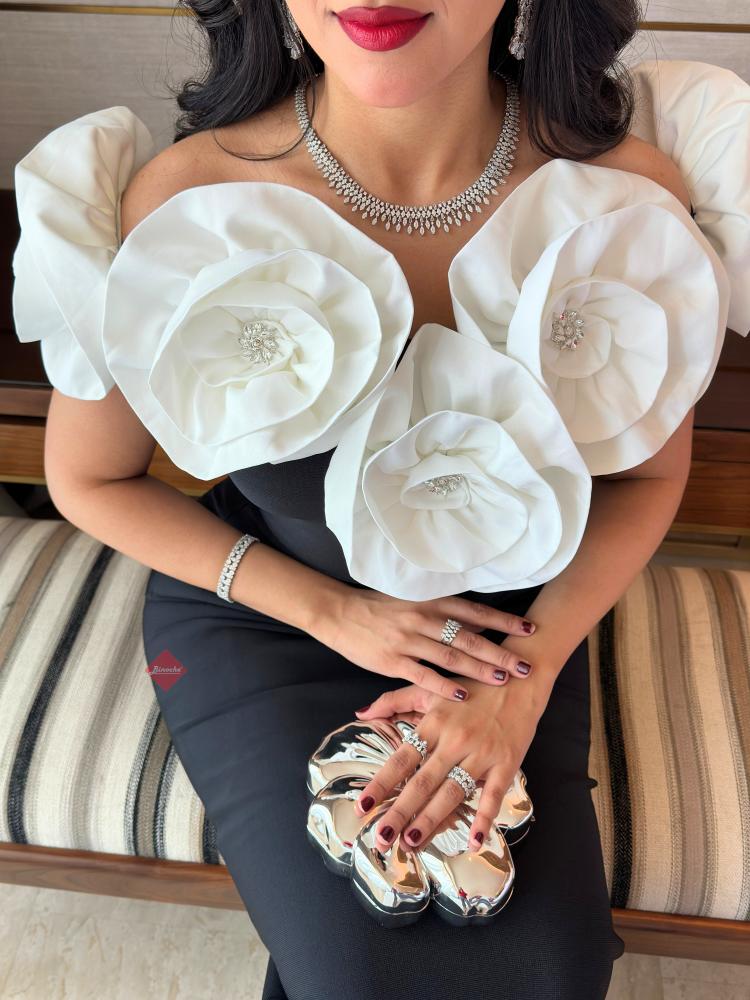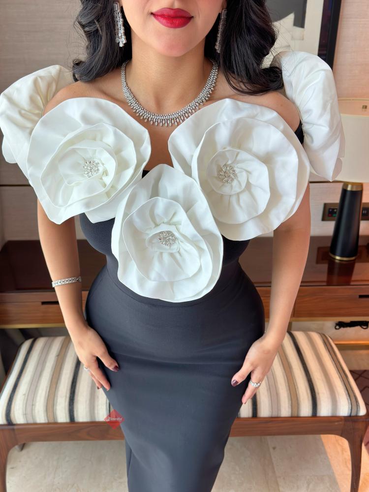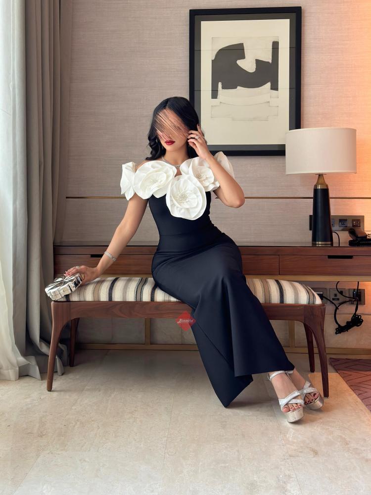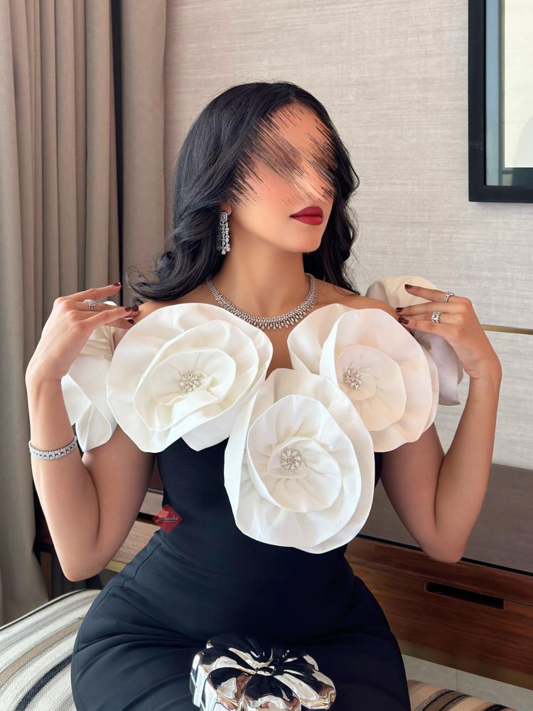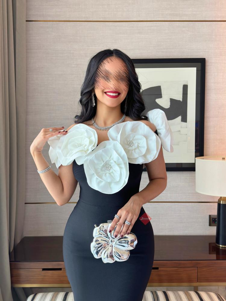 • تفاصيل عن الفستان: كلمة يجنن قليله فيه مثل تصميم البراندات العالمية ، راكز باللبس اوف شولدر مزين بالورود من الصدر و الباقي كله اسود خامة فخمة للزواجات ، تلبسيه و انتي كلك ثقه.