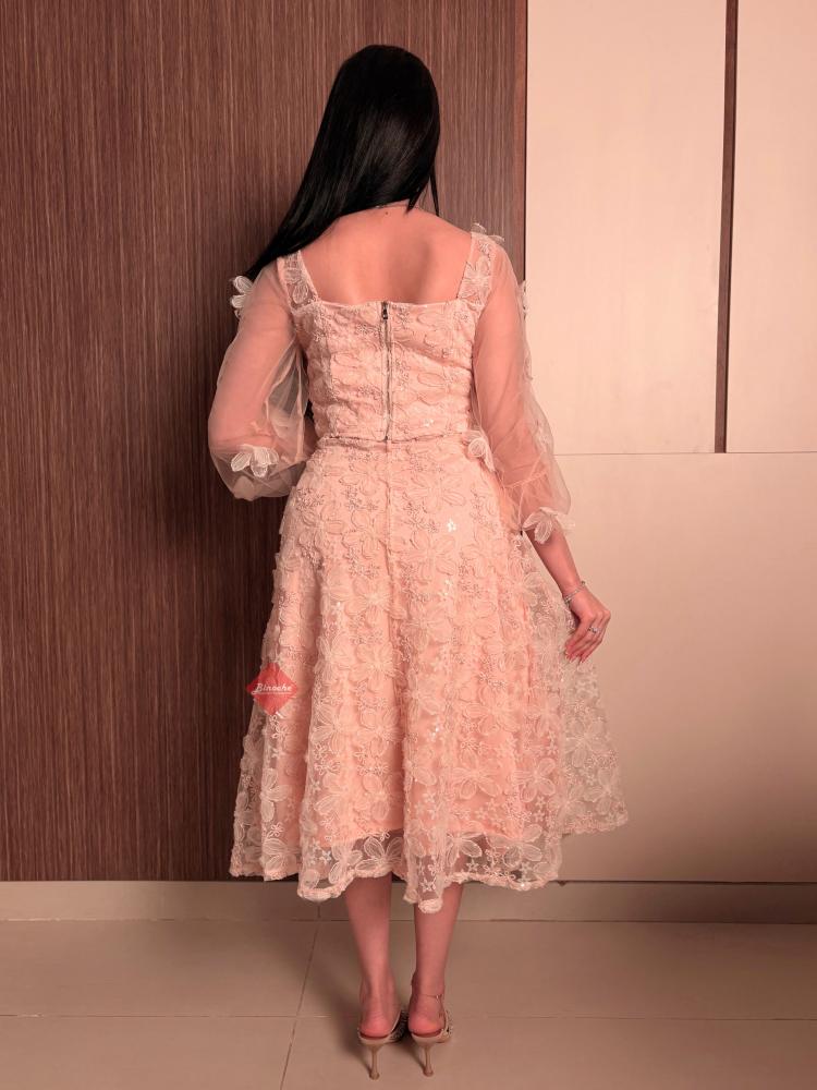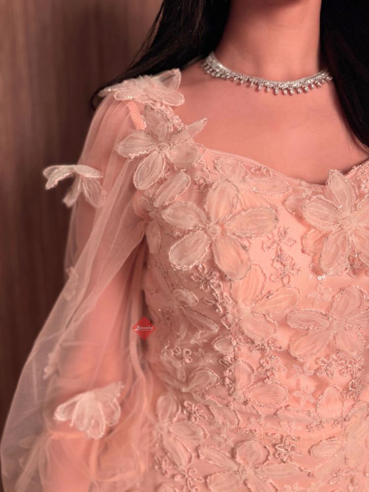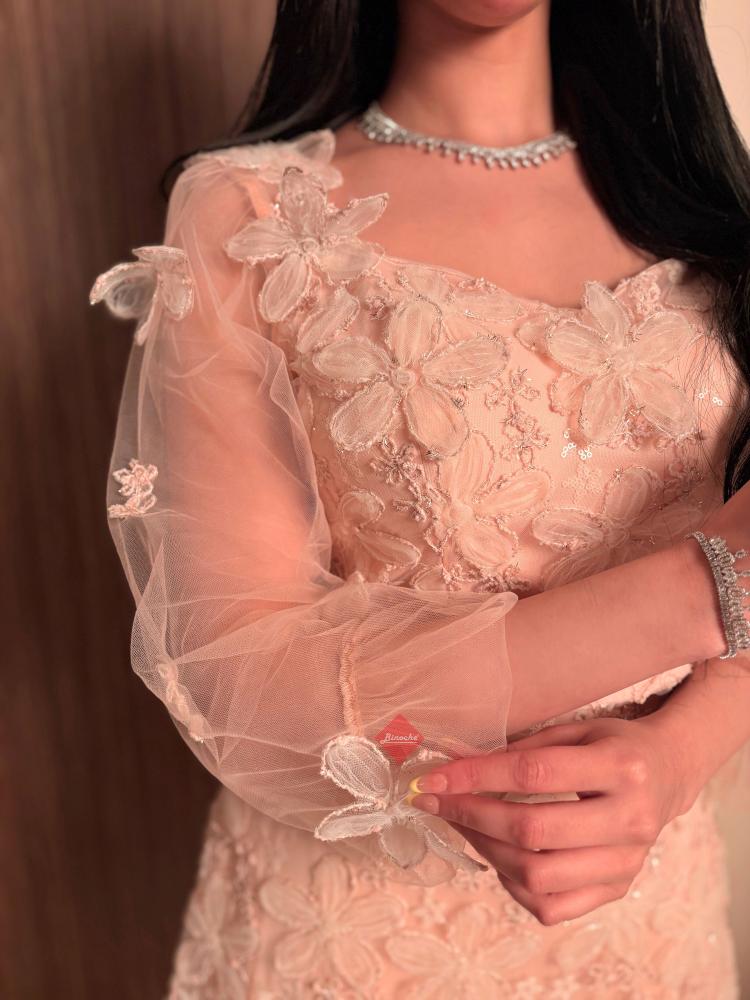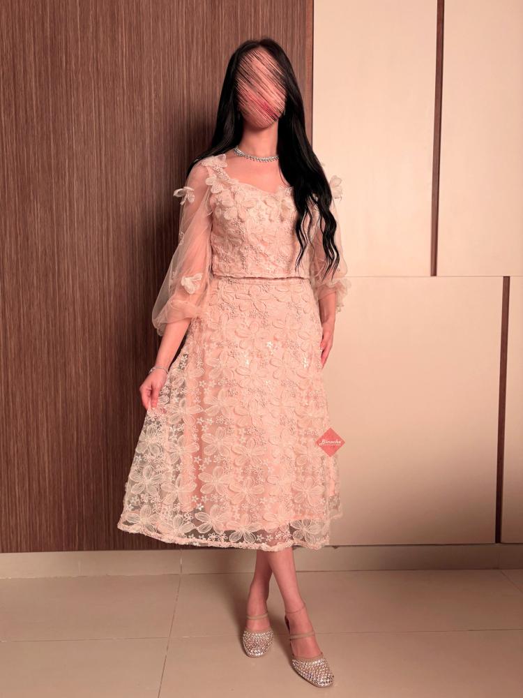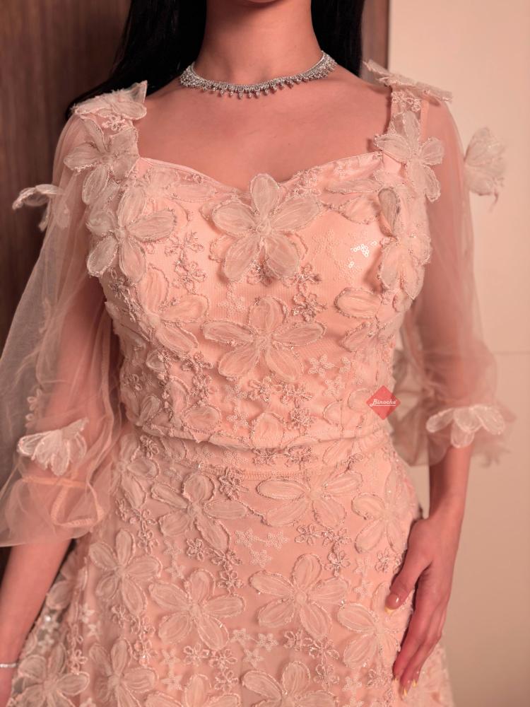 تفاصيل اكثر عن الطقم: صُمم هذا الفستان ليمنحكِ إطلالة أنثوية حالمة، حيث يتميز بجزء علوي (صدر) مشغول بالدانتيل المطرز بدقة على شكل ورود بارزة، مع أكمام طويلة شفافة تضفي لمسة من الرقي. تنسدل التنورة المصنوعة من الدانتيل المطرز بدقة على شكل ورود بارزة ، مما يوفر لكِ حركة انسيابية وجذابة في كل خطوة.