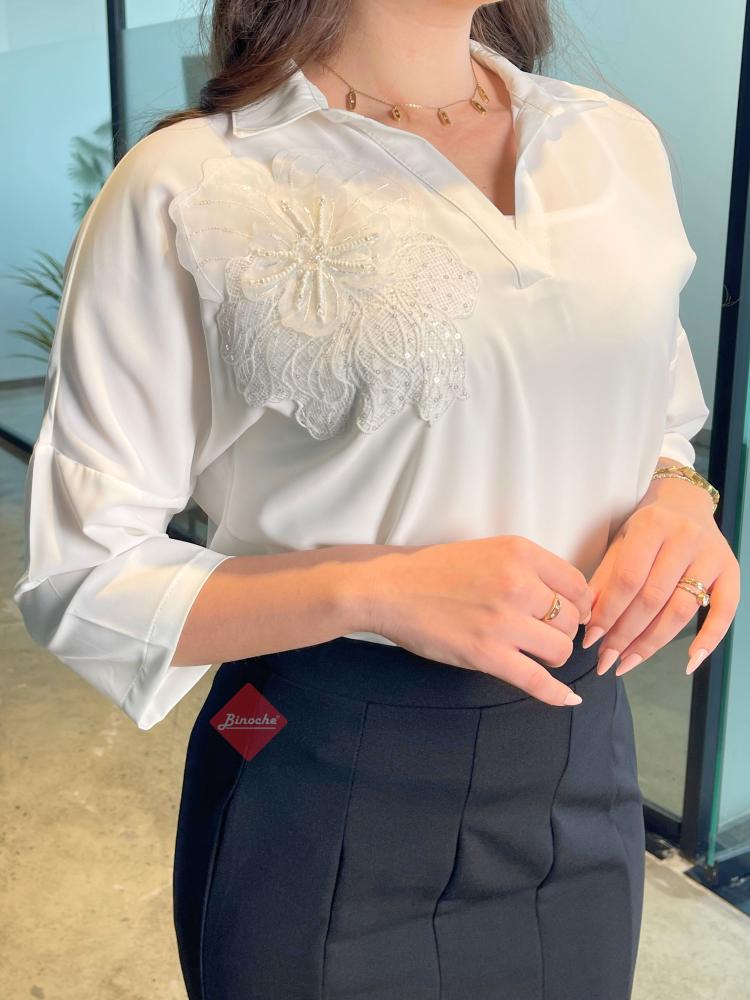 بلوزة أنيقة ستايل نص كم مع تطريز وردة