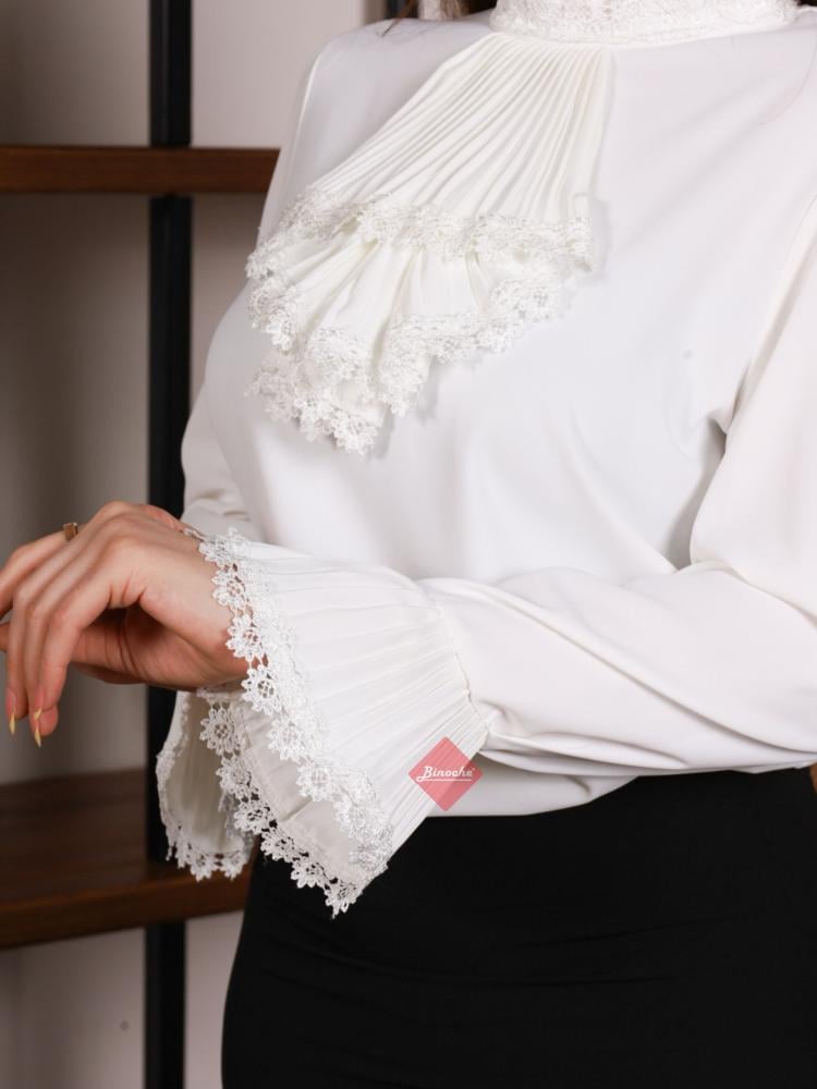 - تفاصيل اكثر عن البلوزة: تألقي بإطلالة فاخرة مع هذا القميص الأنيق المصمم بأكمام طويلة مع تفاصيل كشكش فاخرة على الصدر والأكمام يمكن تنسيقه بسهولة مع التنانير أو البناطيل لإطلالة مكتملة الأناقة