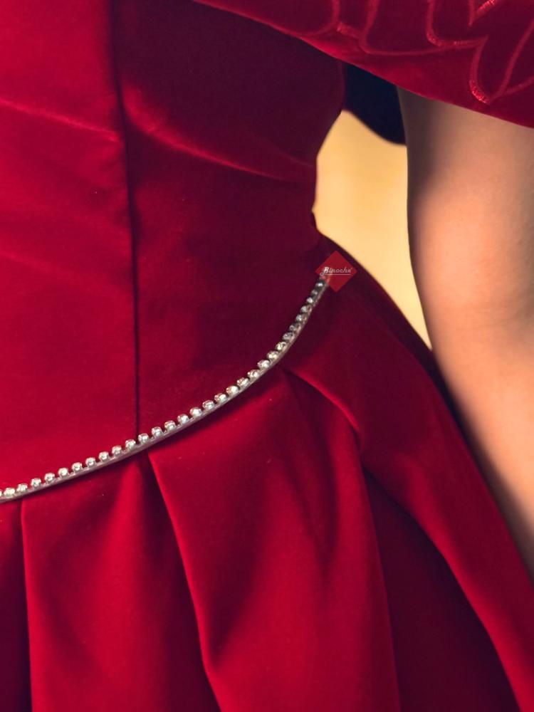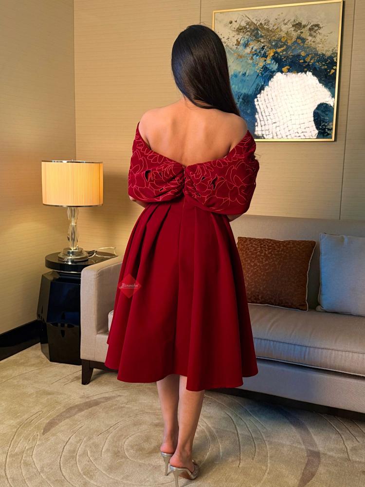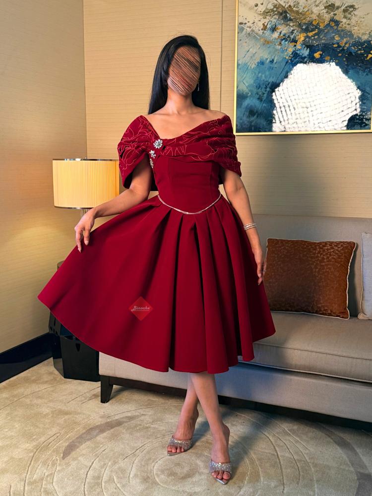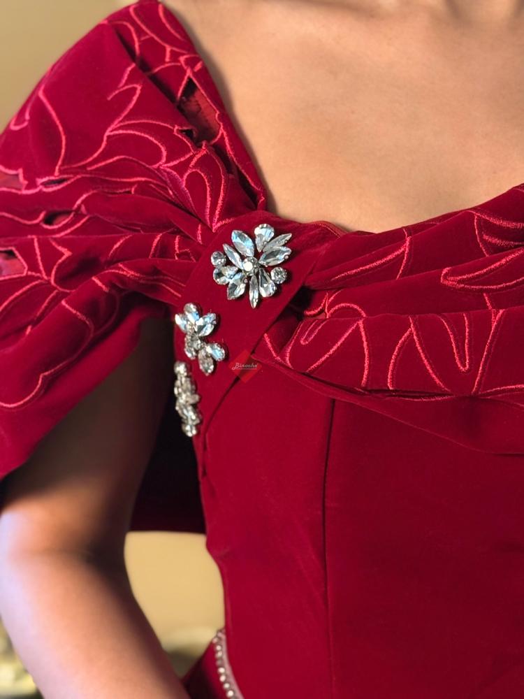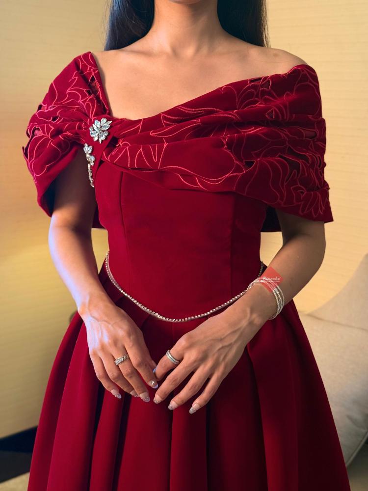 فستان جوخ شموه ميد بقصه اوف شولدر مزينه بالإكسسوار ستايل كلوش