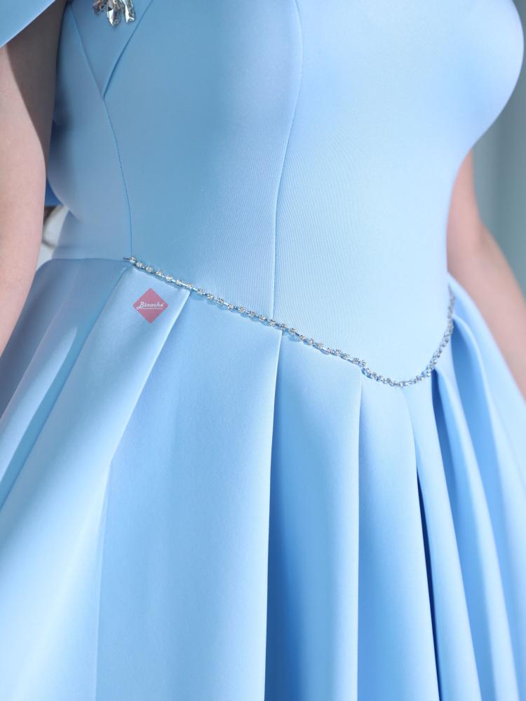 فستان بنك ناعم ميد بقصه اوف شولدر مزينه بالإكسسوار ستايل كلوش