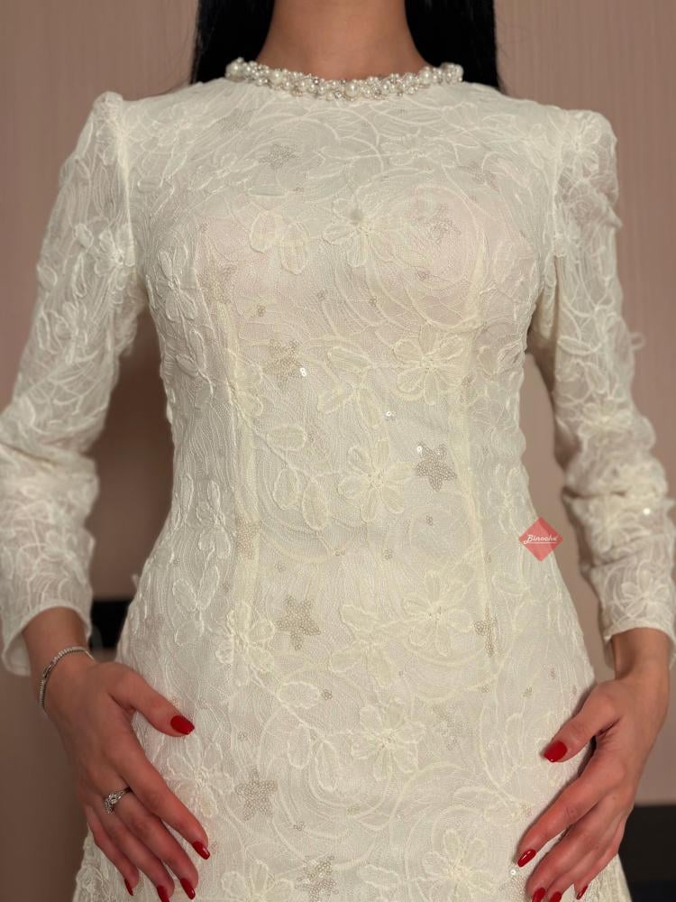 فستان سكري سهرة بأكمام طويلة مزينة بالدانتيل الراقي