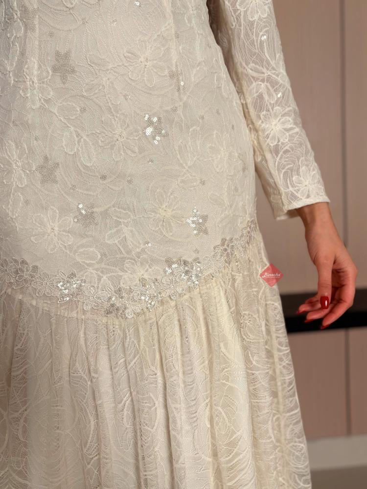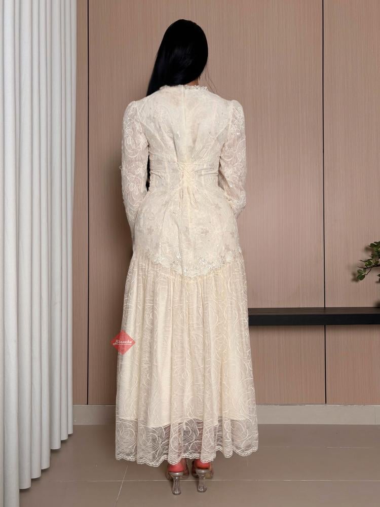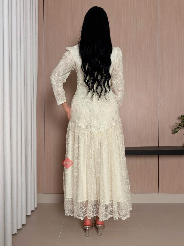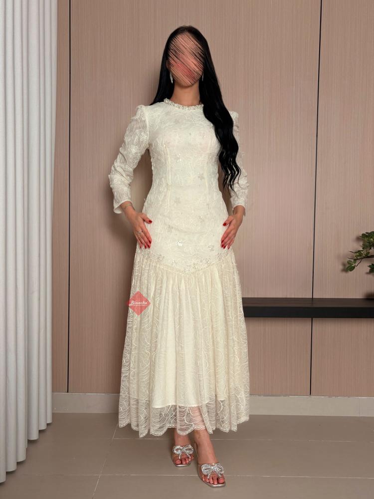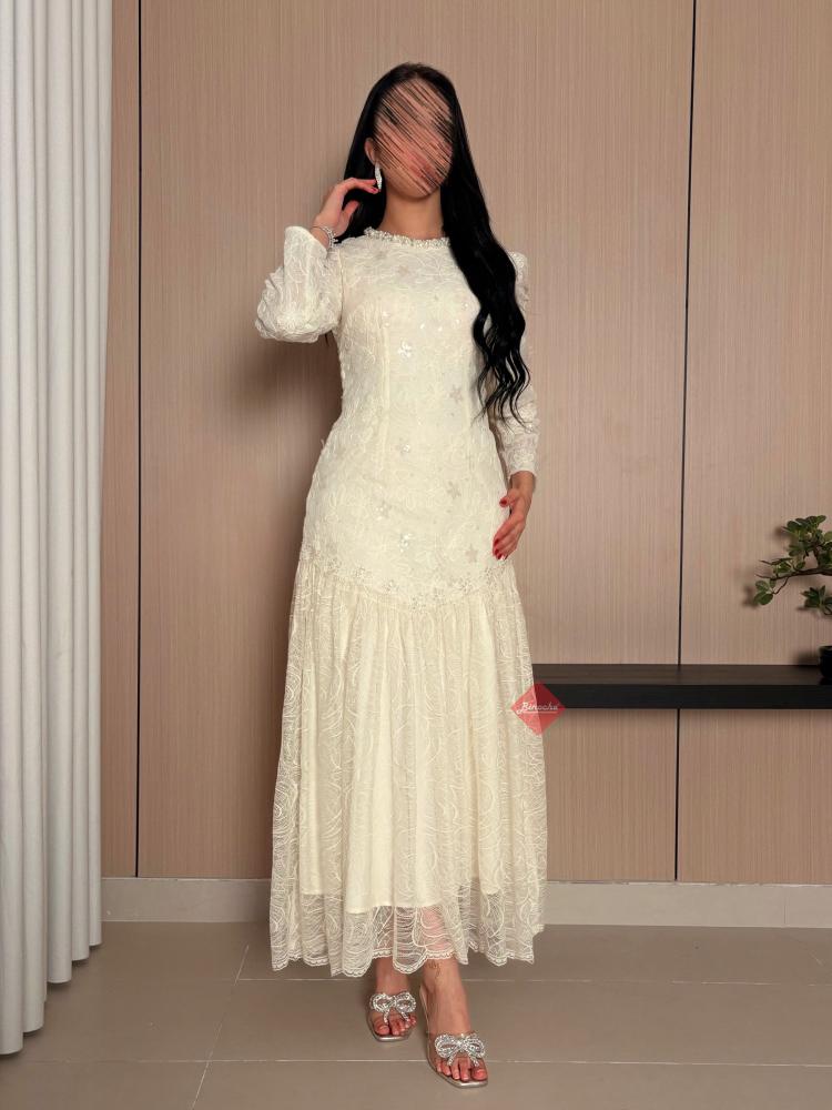 تفاصيل اكثر عن الفستان: يعد هذا الفستان قطعة أساسية في كولكشن العيد 2026، حيث صُمم من أجود أنواع الدانتيل المشغول بنقوش زهرية رقيقة تغطي الفستان بالكامل لتمنحكِ مظهراً أنثوياً هادئاً. يتميز التصميم بقصة "ميدي" انسيابية بكسرات ناعمة عند التنورة، مما يجعله الخيار الأمثل للباحثات عن الأناقة المحتشمة والراقية.