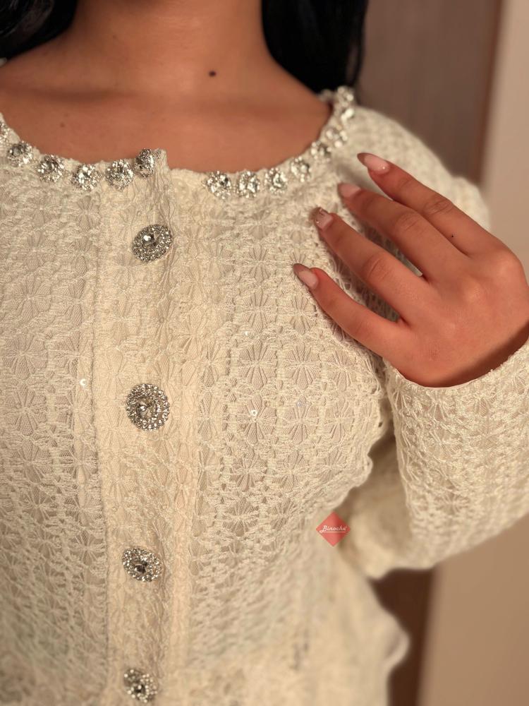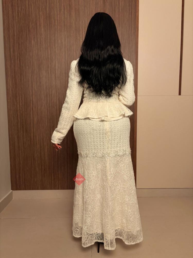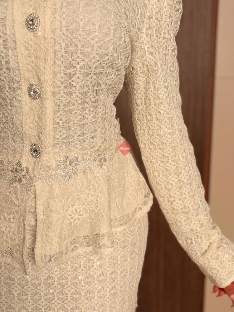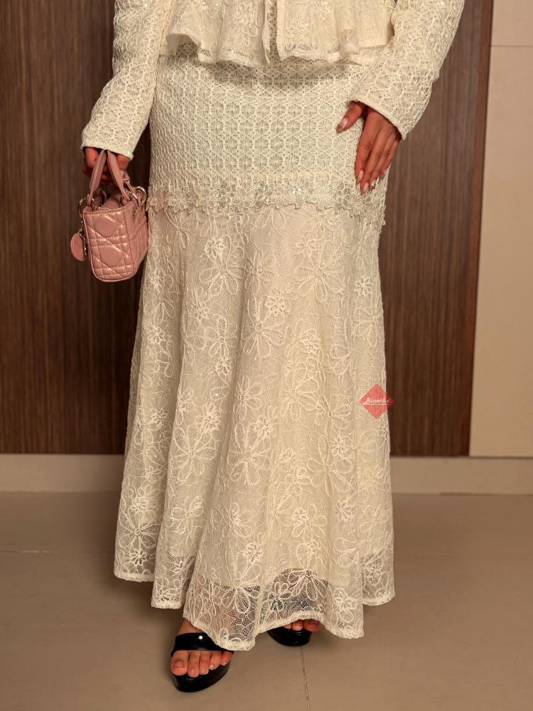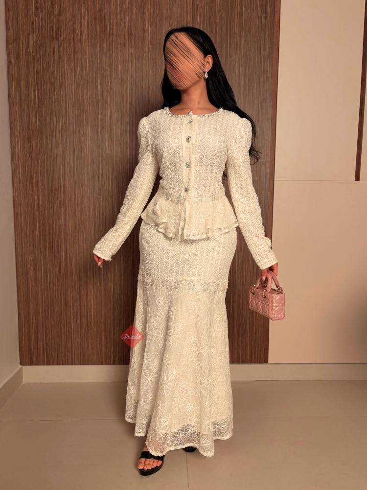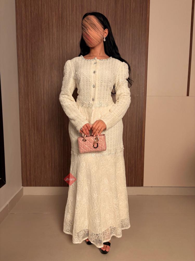تفاصيل اكثر عن الطقم: يعد هذا الطقم الأبيض قطعة استثنائية من كولكشن العيد والمناسبات، حيث يبرز فيه التناغم بين القماش المشغول بدقة والتفاصيل البراقة. يتكون الطقم من جاكيت علوي بتصميم البيبلوم (Peplum) الذي يحدد الخصر بأنوثة طاغية، وتنورة طويلة تبرز جمال القوام، مما يجعله الخيار الأول للباحثات عن الأناقة المحتشمة والفاخرة في آن واحد.