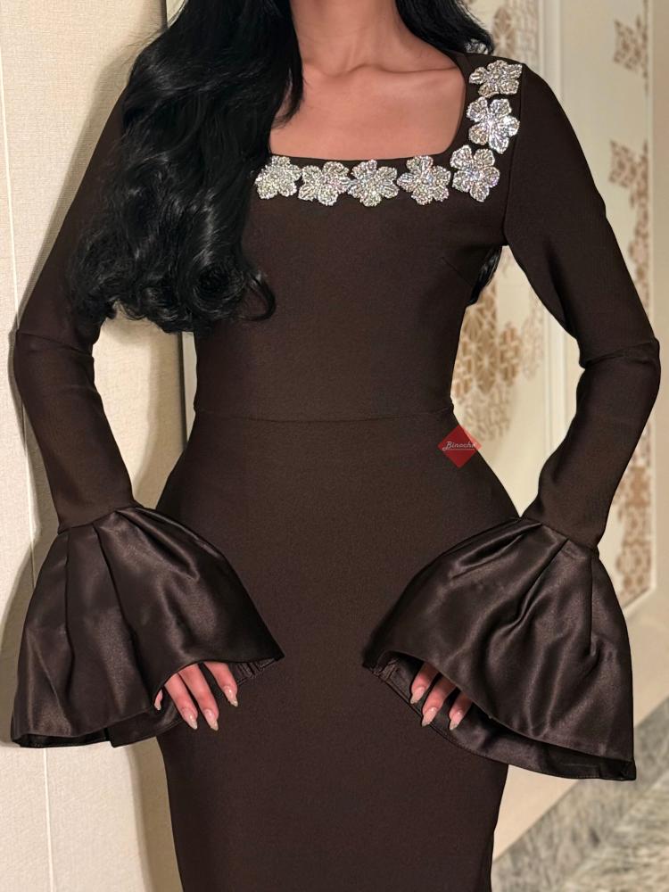 فستان ناعم مزين بالكريستال و اكمام طويلة واسعة