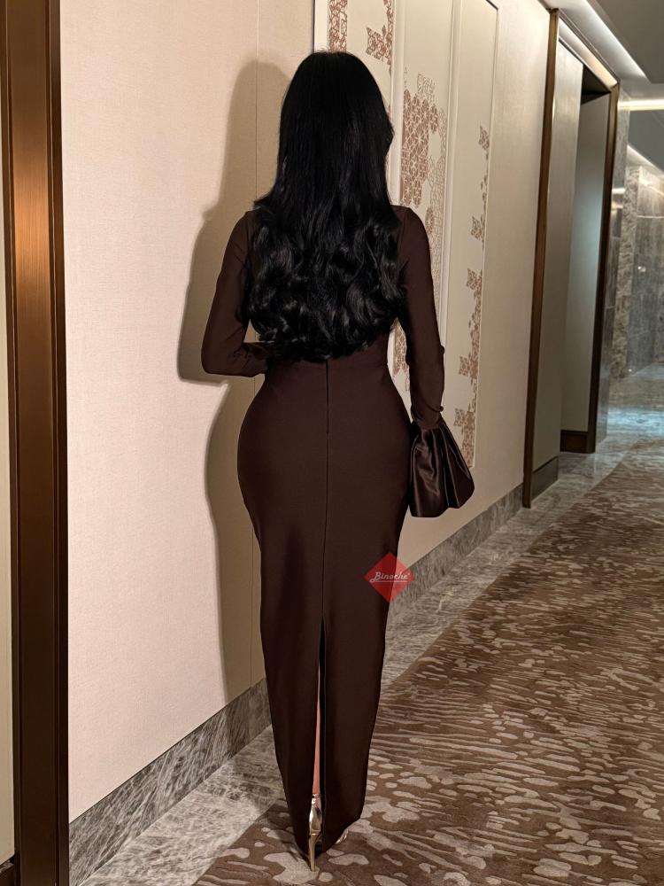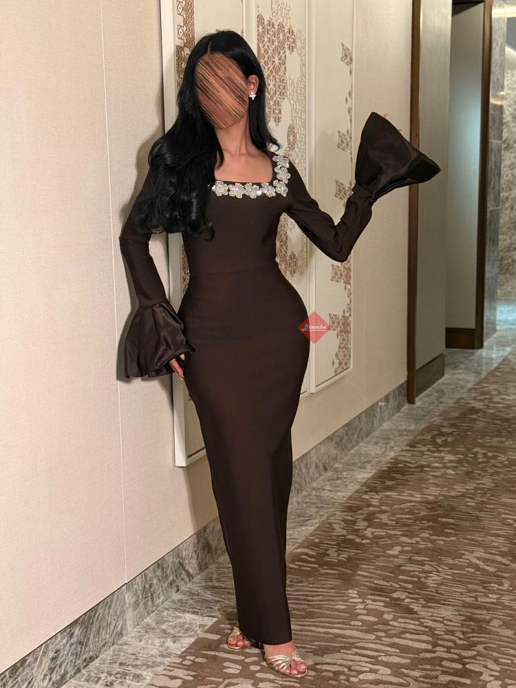 ، المصمم خصيصًا للسهرات والمناسبات الخاصة. يتميز الفستان بقصة ضيّقة تبرز جمال القوام، وأكمام طويلة مميزة بكشكشة فاخرة من الساتان تضيف لمسة راقية.