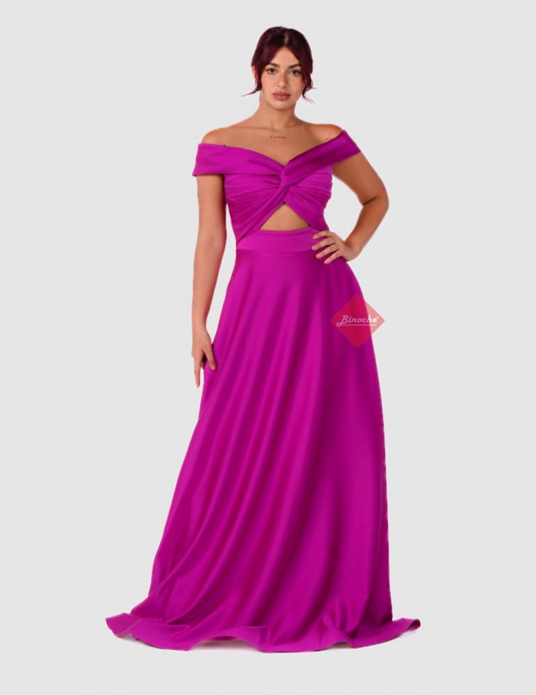 فستان سهرة ستان ناعم فوشي اوف شولدر